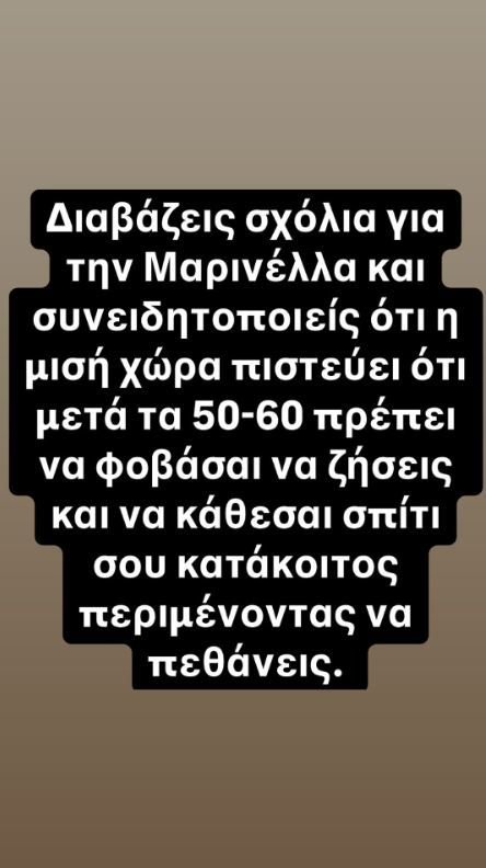 «Διαβάζεις σχόλια για την Μαρινέλλα και συνειδητοποιείς ότι η μισή χώρα πιστεύει ότι μετά τα 50-60 πρέπει να φοβάσαι να ζήσεις και να κάθεσαι σπίτι σου κατάκοιτος περιμένοντας να πεθάνεις».