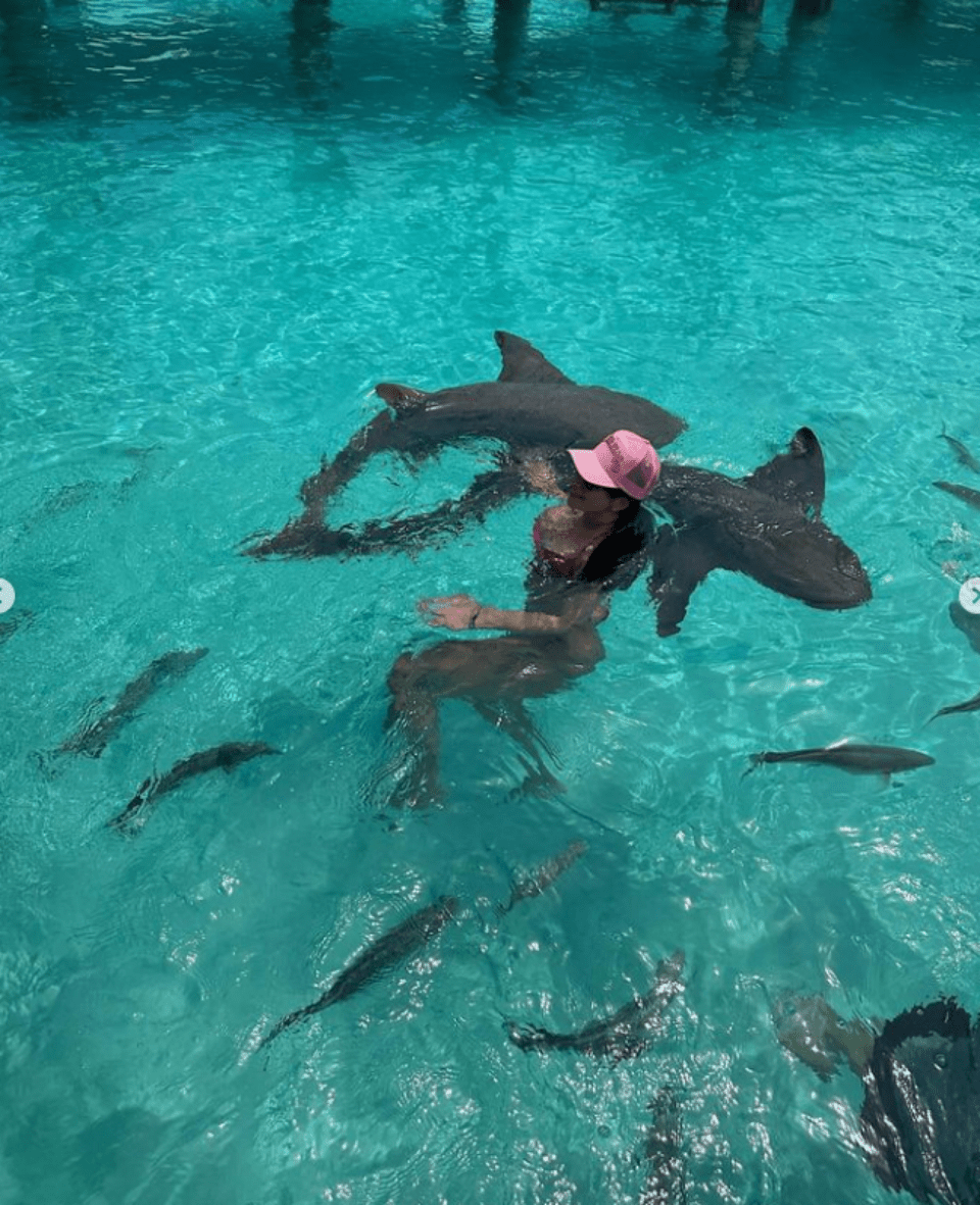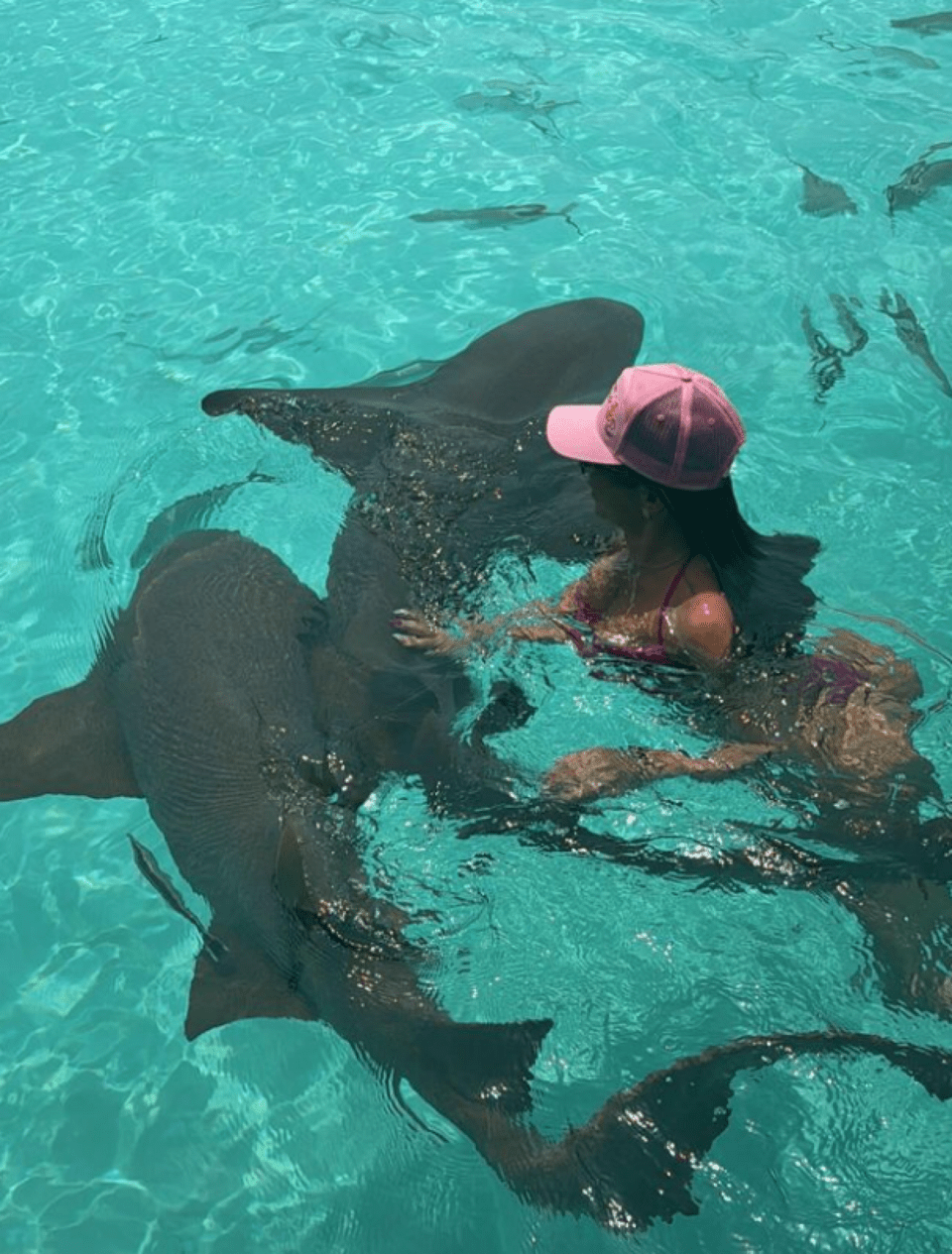 Εκτός από πόζες στα βράχια και το σκάφος με το φούξια μπικίνι της, η ελληνικής καταγωγής κολλητή φίλη της Κάιλι Τζένερ ανάρτησε μερικά στιγμιότυπα στα οποία φαίνεται να κολυμπάει ανάμεσα σε καρχαρίες.