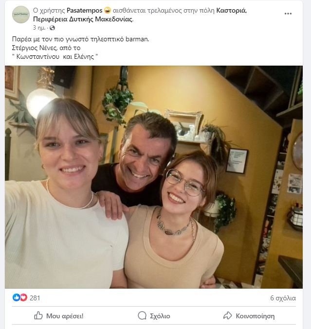 «Παρέα με τον πιο γνωστό τηλεοπτικό barman. Στέργιος Νένες από το Κωνσταντίνου & Ελένης», έγραψε η επιχείρηση στη λεζάντα της φωτογραφίας.