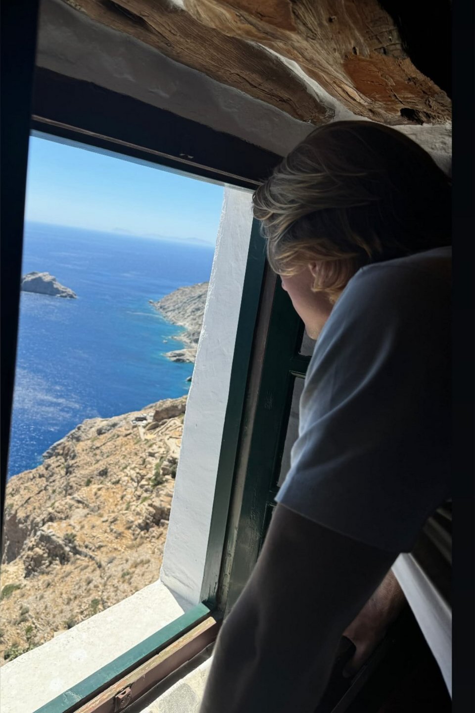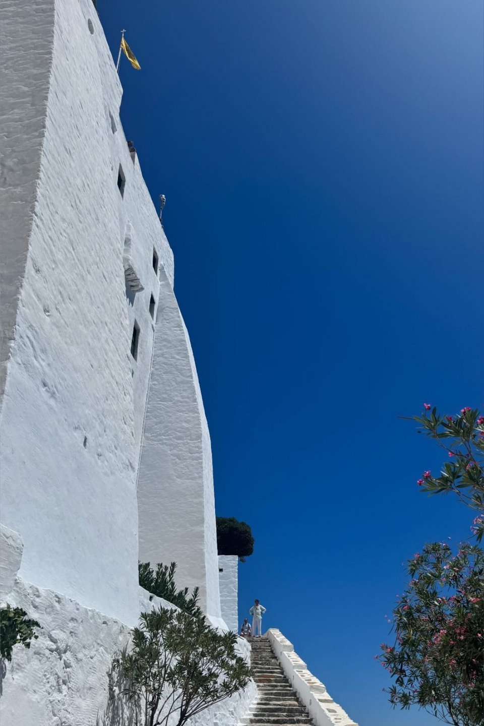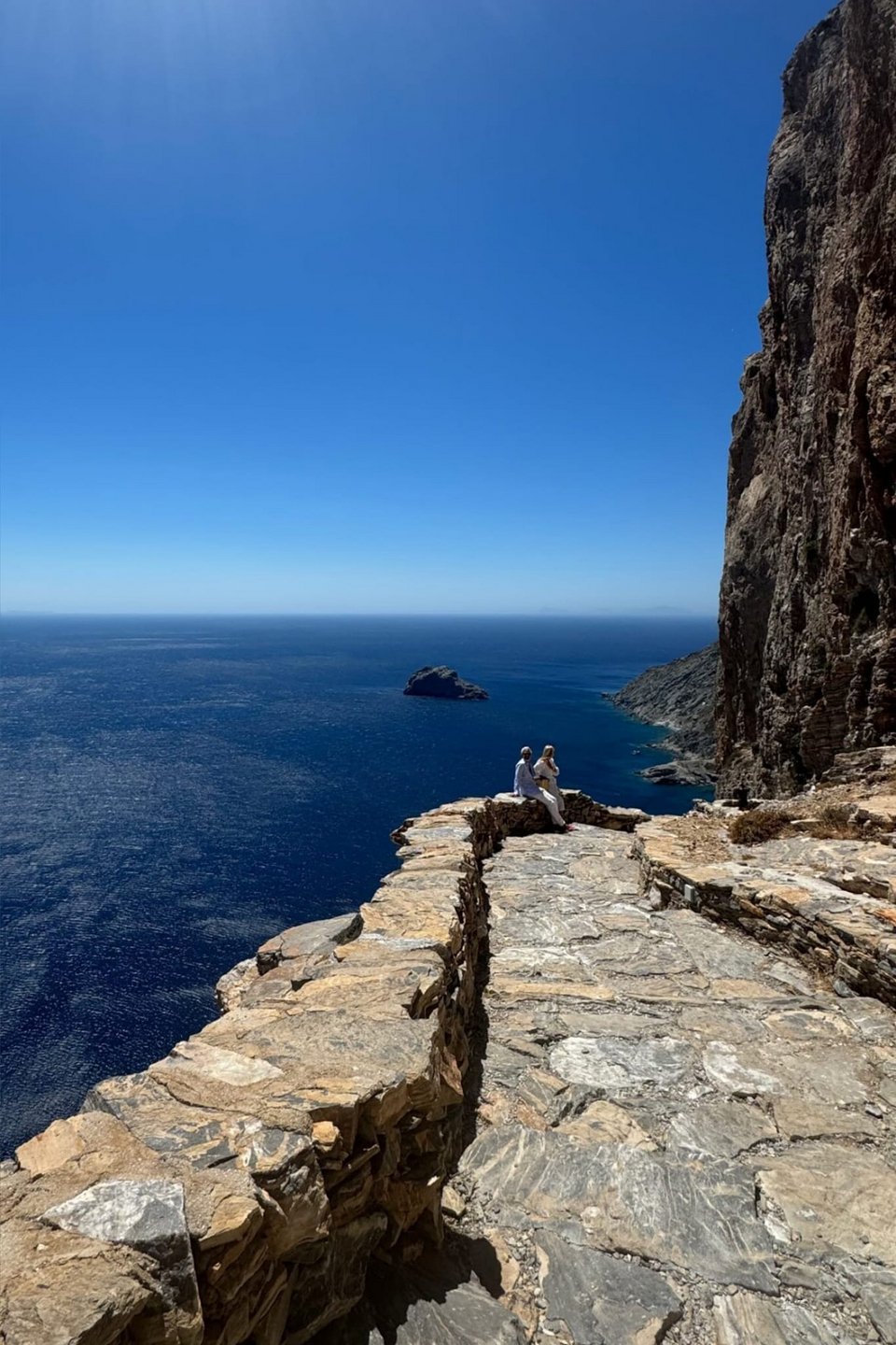 Σήμερα το πρωί, μάλιστα, επισκέφθηκαν το μοναστήρι της Παναγίας της Χοζοβιώτισσας. Εκεί τους υποδέχθηκε ο πατέρας Σπυρίδωνας, κερνώντας ψημένη, το παραδοσιακό ποτό της Αμοργού, και γλυκό τριαντάφυλλο. Στη συνέχεια τους ξενάγησε στους χώρους του μοναστηριού και απόλαυσαν την υπέροχη θέα του απέραντου γαλάζιου από την κορυφή.