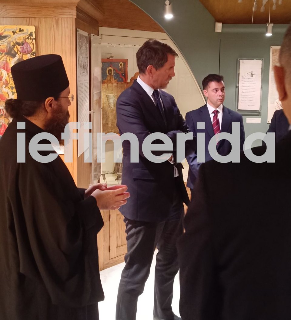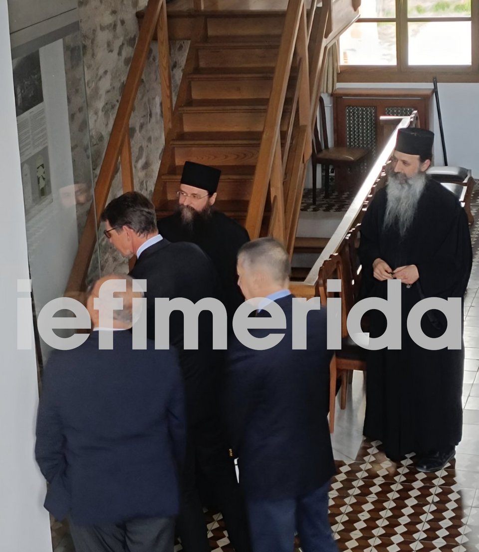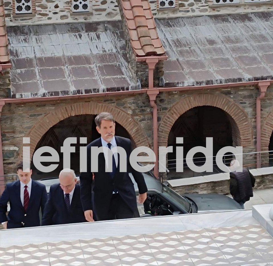 Ο γιος του τέως βασιλιά Κωνσταντίνου έφτασε νωρίτερα στις Καρυές, όπου τον υποδέχθηκαν ο διοικητής του Αγίου Όρους Αλκιβιάδης Στεφανής, ο πρωτεπιστάτης πατέρας Αβραάμ και τα υπόλοιπα μέλη της επιστασίας.