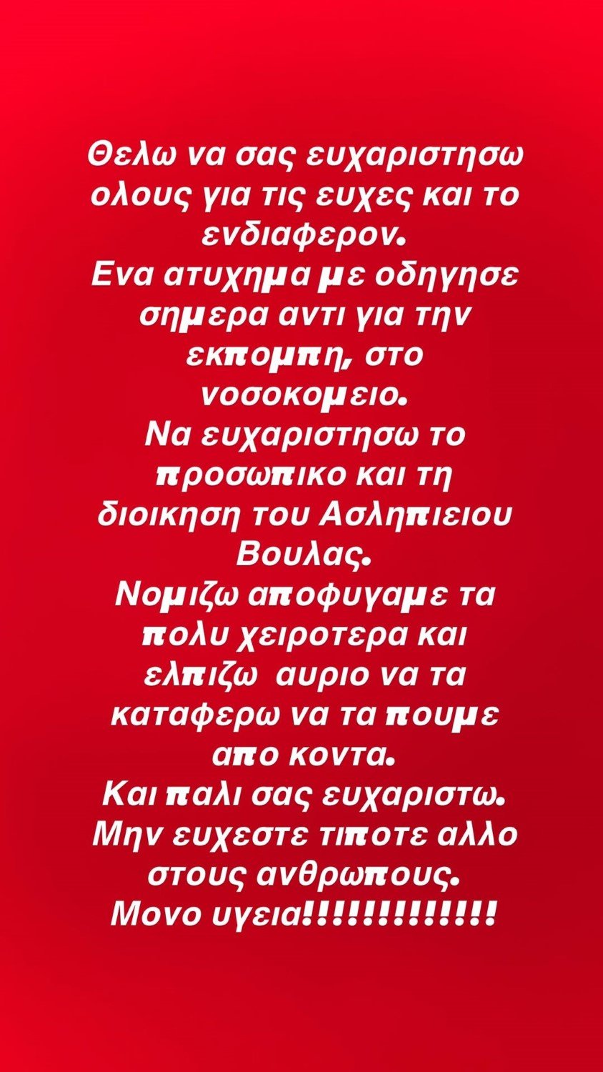 «Θέλω να σας ευχαριστήσω όλους για τις ευχές και το ενδιαφέρον. Ένα ατύχημα με οδήγησε σήμερα αντί για την εκπομπή στο νοσοκομείο. Να ευχαριστήσω το προσωπικό και τη διοίκηση του Ασκληπιείου Βούλας.