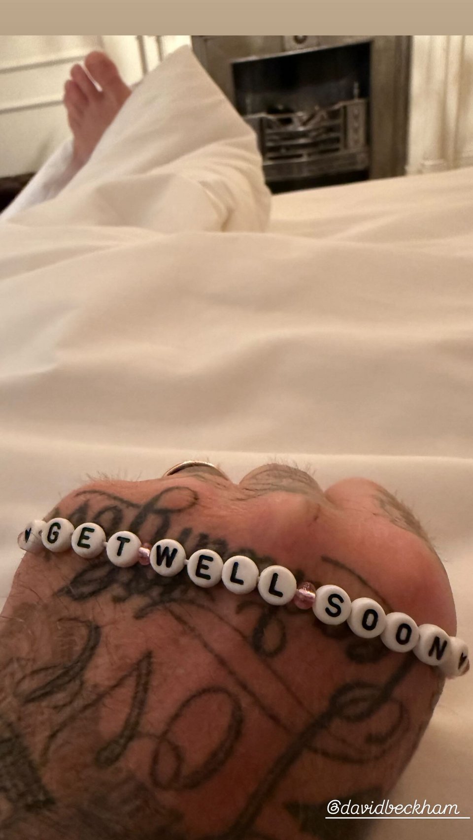 Μια δεύτερη φωτογραφία έδειχνε τον Ντέιβιντ να φορά ένα παιδικό βραχιολάκι που έγραφε: «Περαστικά».