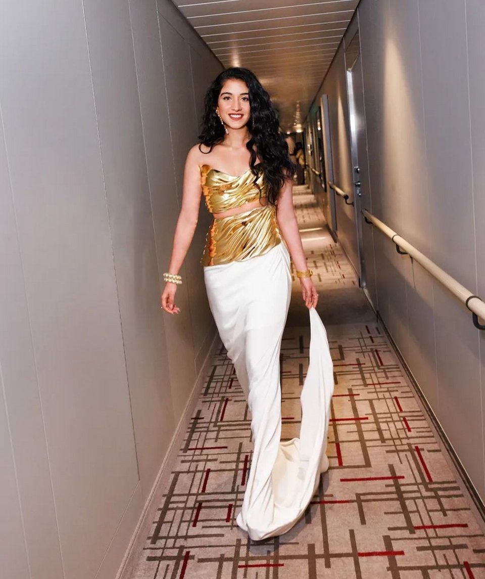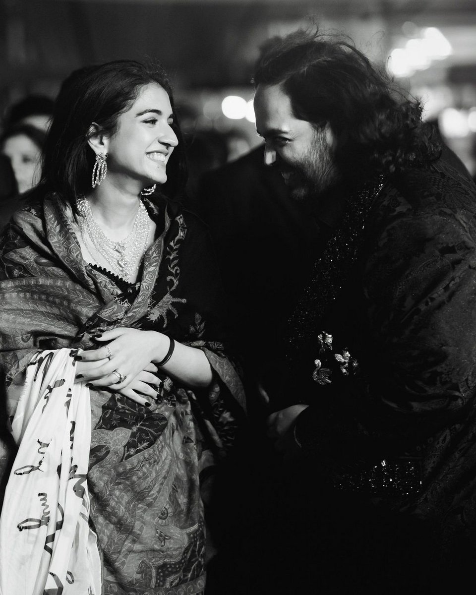 Για το εκθαμβωτικό σουαρέ, η Radhika επέλεξε ένα ασπρόμαυρο φόρεμα Robert Wun που είχε ένα γράμμα αγάπης που είχε γράψει o Anant ραμμένο στη φούστα.