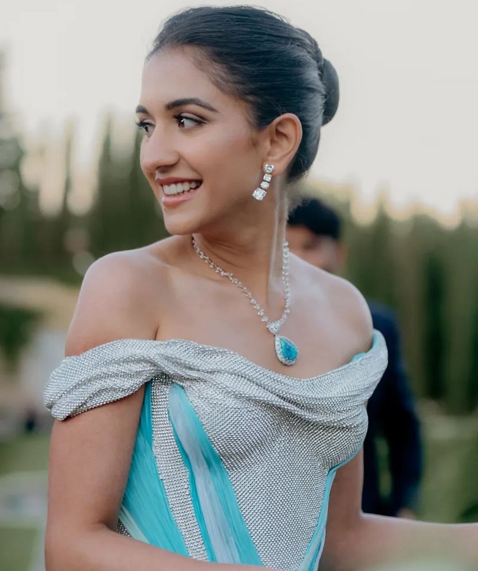 Συνδύασε το φόρεμα με ένα εντυπωσιακό κολιέ από μπλε οπάλιο πάνω σε μια διαμαντένια αλυσίδα - τις πέτρες της ίδιας και του Anant - που φτιάχτηκε από τη Lorraine Schwartz.