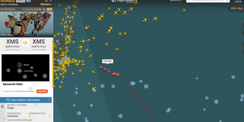 Παραμονή Χριστουγέννων, την ώρα που μικροί και μεγάλοι μετρούν αντίστροφα για τα δώρα και τη μαγεία της συγκεκριμένης ημέρας, το FlightRadar 24 δίνει τη δυνατότητα στους πιο ανυπόμονους να παρακολουθήσουν σε ζωντανό χρόνο την πιο διάσημη «πτήση» του πλανήτη, εκείνη του Αγίου Βασίλη.