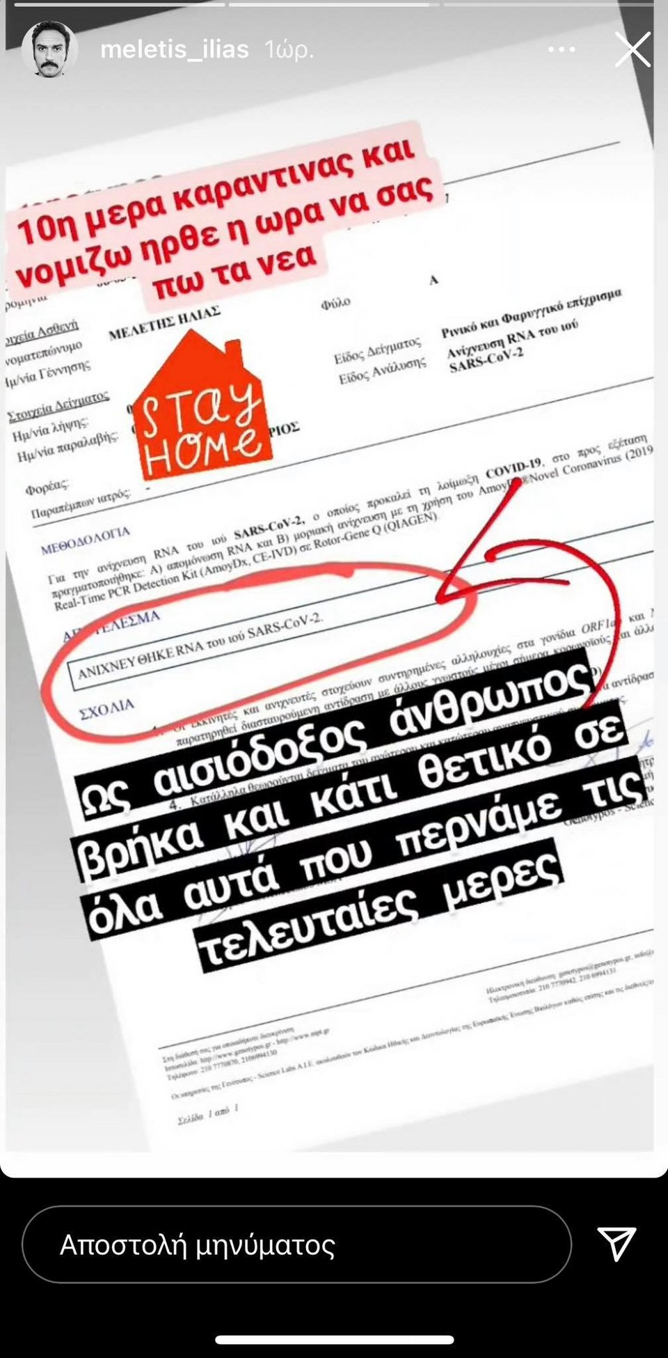 Το γεγονός αυτό ανακοίνωσε ο ίδιος σε story στο Instagram, δείχνοντας μάλιστα φωτογραφία με το θετικό αποτέλεσμα του τεστ.