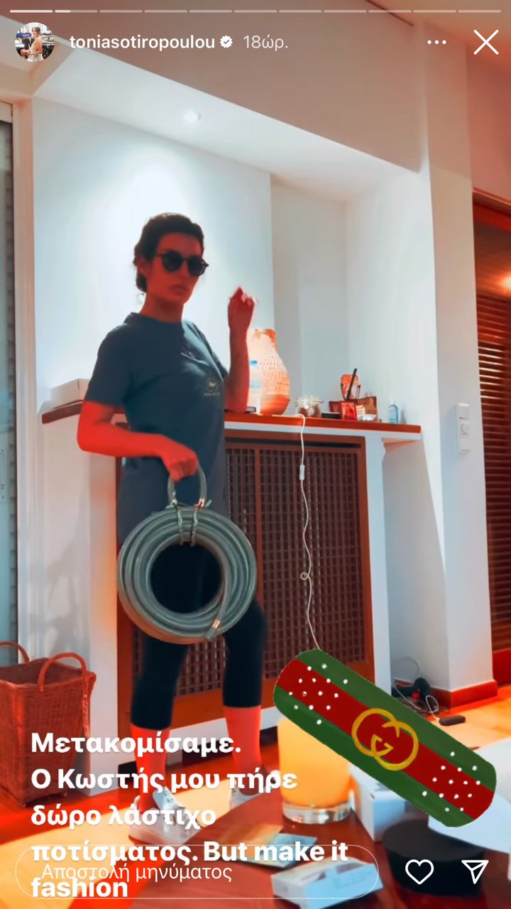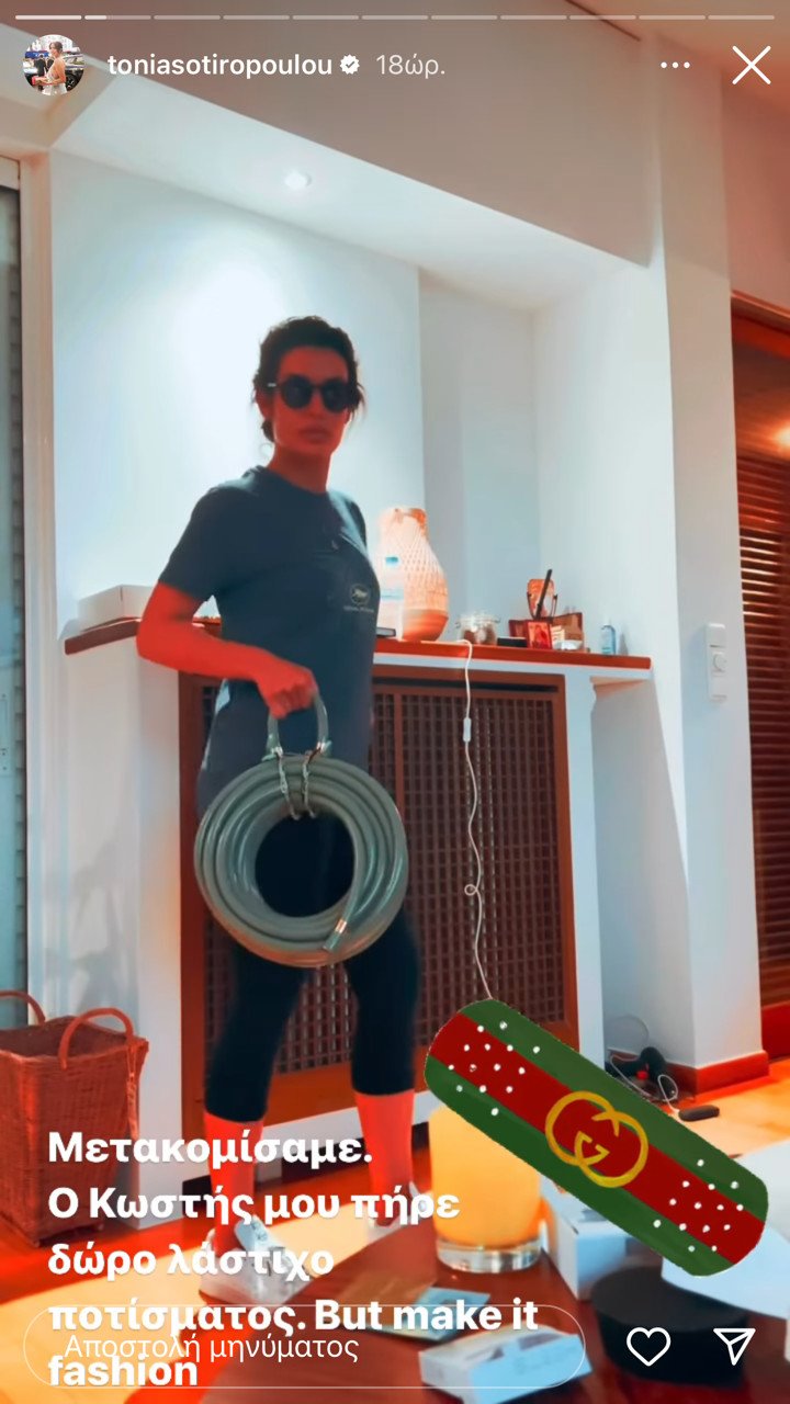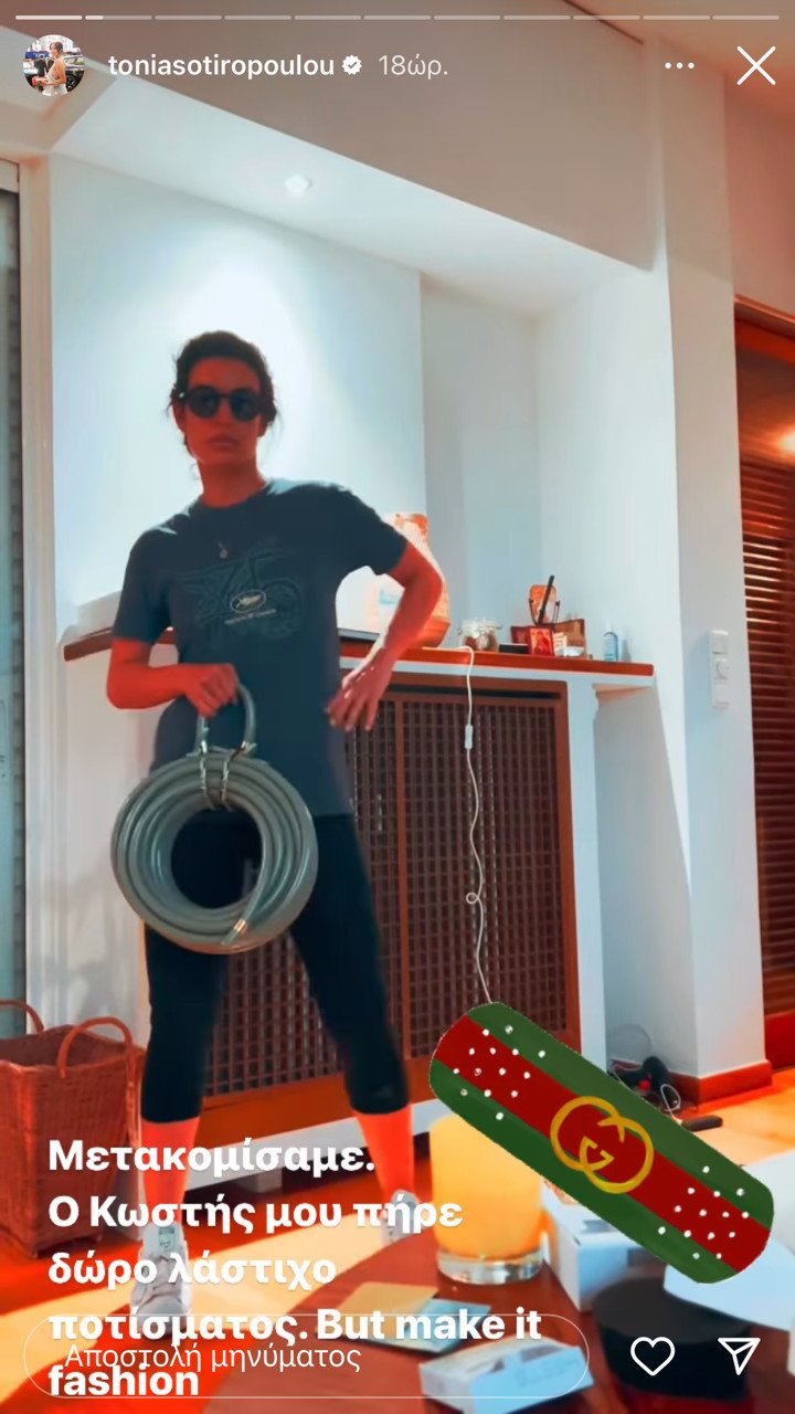 «Μετακομίσαμε. Ο Κωστής μου έκανε δώρο ένα λάστιχο ποτίσματος. But make it fashion», έγραψε η Τόνια Σωτηροπούλου ενώ πόζαρε με στιλ κρατώντας το νέο της δώρο.