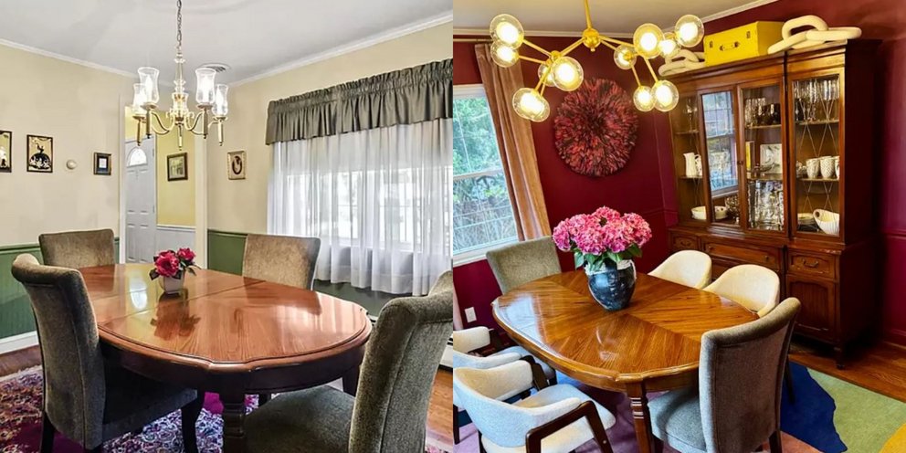 Η πιο καθοριστική αλλαγή στην τραπεζαρία ήταν το χρώμα των τοίχων. Κατά τη μετακόμιση, ανέθεσαν σε εργολάβο το βάψιμο όλων των χώρων. Για την τραπεζαρία επέλεξαν την απόχρωση Juneberry της Sherwin-Williams, τόσο για τους τοίχους όσο και για το wainscoting.