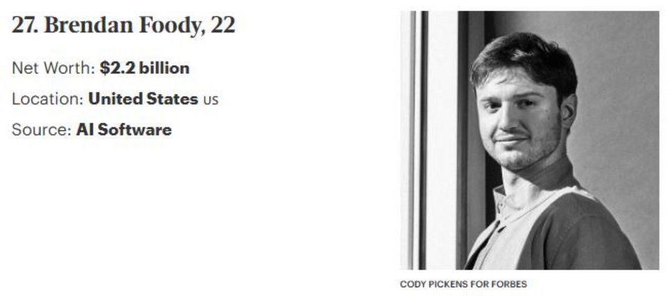 Το Forbes καταγράφει συνολικά 71 αυτοδημιούργητους δισεκατομμυριούχους ηλικίας 39 ετών ή μικρότερης μέχρι τον Δεκέμβριο του 2025, ισοφαρίζοντας το ιστορικό ρεκόρ του 2021. Η πλειονότητα των νέων δισεκατομμυριούχων προέρχεται από τoν κόσμο της τεχνολογίας (48) ή τα χρηματοοικονομικά και τις επενδύσεις (12), ενώ οι Αμερικανοί αποτελούν σχεδόν τους μισούς (32) από αυτούς. Η Κίνα, η Ινδία, η Αυστραλία, η Σουηδία και ο Καναδάς συμπληρώνουν την πρώτη εξάδα, ενώ οκτώ από αυτούς είναι γυναίκες.