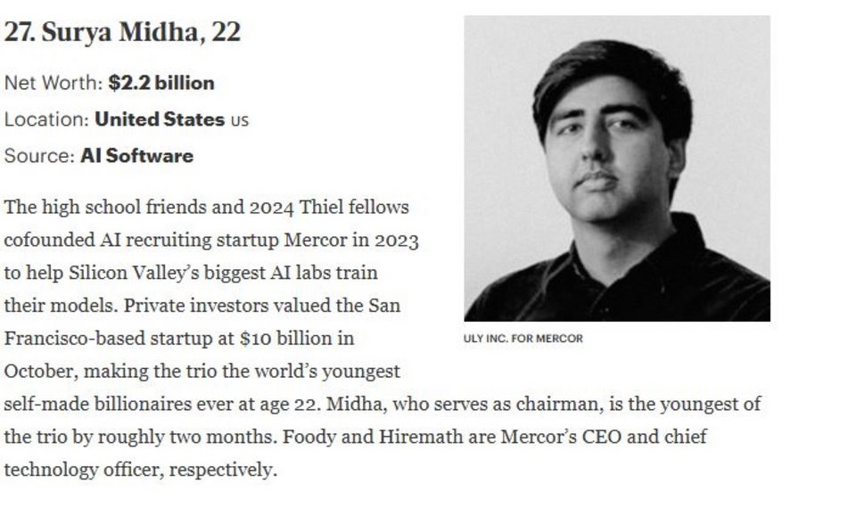 Το Forbes ανακοίνωσε πρόσφατα ότι οι τρεις φίλοι, Adarsh Hiremath, Brendan Foody και Surya Midhi, ίδρυσαν την startup Mercor το 2023, μια πλατφόρμα λογισμικού τεχνητής νοημοσύνης που υποστηρίζει τα μεγαλύτερα εργαστήρια AI της Silicon Valley στην εκπαίδευση των μοντέλων τους.