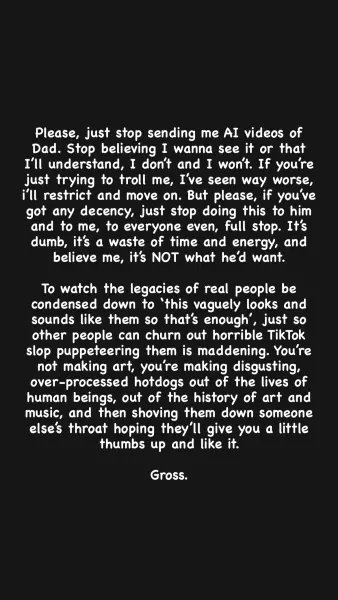 «Σας παρακαλώ, απλώς σταματήστε να μου στέλνετε βίντεο με τον μπαμπά φτιαγμένα με τεχνητή νοημοσύνη» έγραψε η Ζέλντα σε ανάρτησή της στα Insta stories τη Δευτέρα 6 Οκτωβρίου. «Σταματήστε να πιστεύετε ότι θέλω να το βλέπω ή ότι θα το καταλάβω – δεν θέλω και δεν πρόκειται να το καταλάβω».