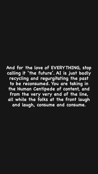«Και για την αγάπη όλων των πραγμάτων, σταματήστε να την αποκαλείτε ‘το μέλλον» έγραψε οργισμένα. «Η τεχνητή νοημοσύνη απλώς ανακυκλώνει και αναμασά άσχημα το παρελθόν, για να το καταναλώσουμε αρχικά. Απορροφάτε το περιεχόμενο σαν να συμμετέχετε στη “Human Centipede” εκδοχή του, στο πολύ-πολύ τέλος της αλυσίδας, ενώ εκείνοι που βρίσκονται μπροστά γελάνε και γελάνε, καταναλώνοντας ασταμάτητα», κατέληξε η Ζέλντα.
