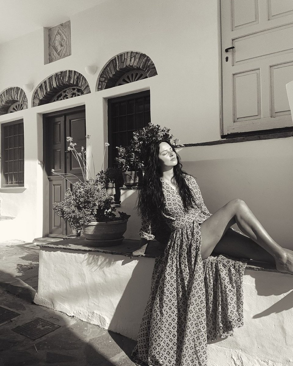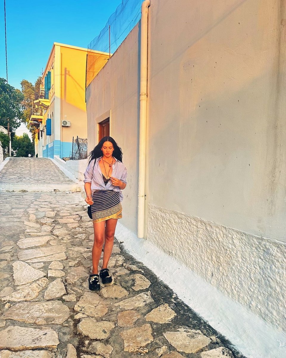 Σε άλλες εικόνες, η ίδια κάνει ηλιοθεραπεία με μικροσκοπικό μαύρο μπικίνι, και ποζάρει με μακρύ φόρεμα με σκίσιμο στο πόδι σε κάποιο σοκάκι, στη διάρκεια βόλτας της, αποκαλύπτοντας τα «ατελείωτα» πόδια της.